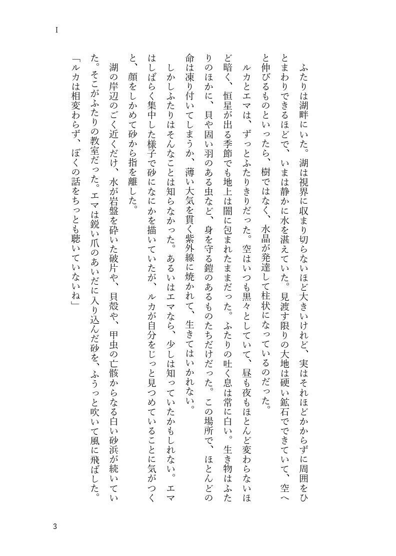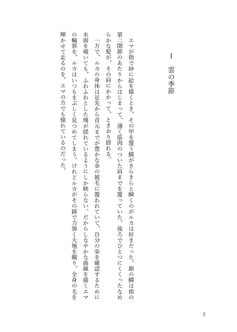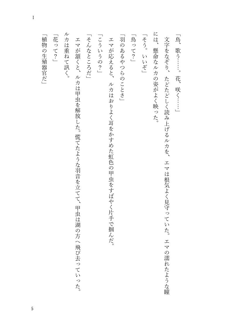 天上には五つの月が巡り、条件が揃うとルカは意識を失って獣のように暴れ回り、エマは望まない産卵期に苦しむ。ふたりは湖で遊び、星を数え、永遠に近い時を過ごすが、やがて破局が訪れる。